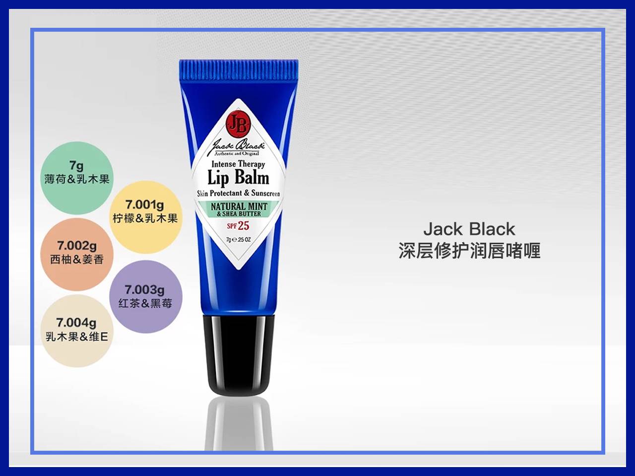 不要以为擦完脸就完事了,一双诱人的嘴唇也是你和女朋友之间爱の粘合剂,你可以用Jack Black深层修护防晒润唇啫喱来打造一个带着天然香气的嘴唇,一共5种口味。