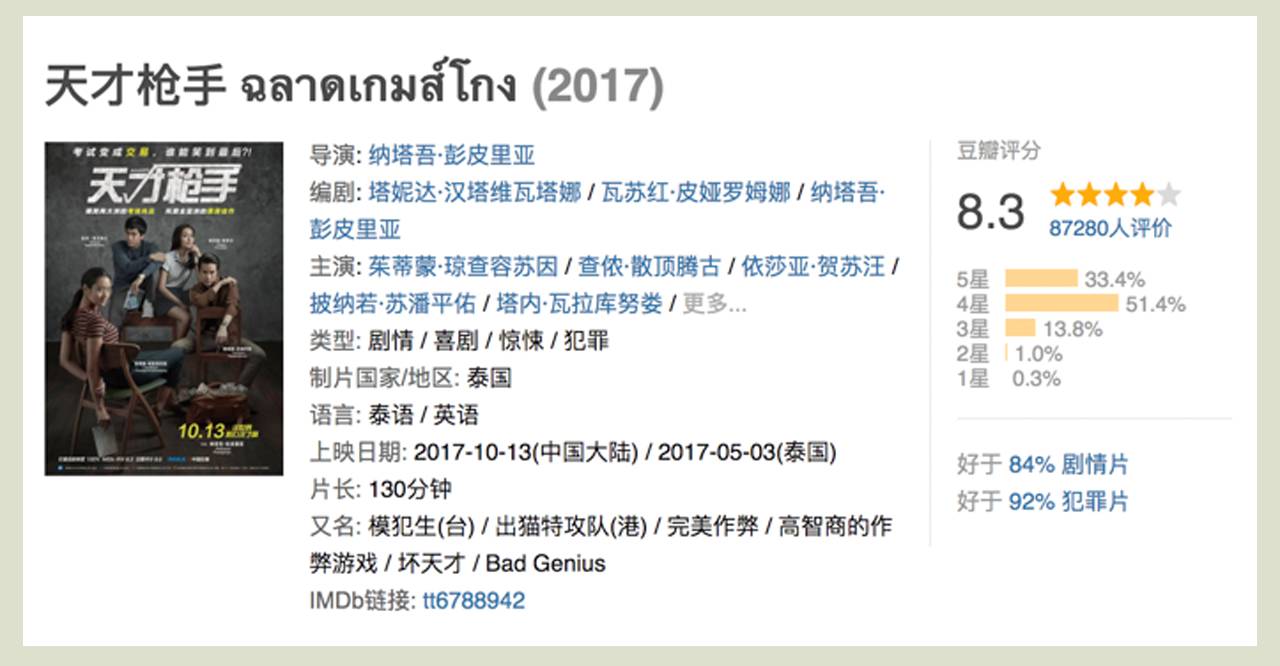 《天才枪手》算是目前上映的电影里评价最高的,宇博身边只要看过的全在安利,在豆瓣上都拿到了8.3的高分。