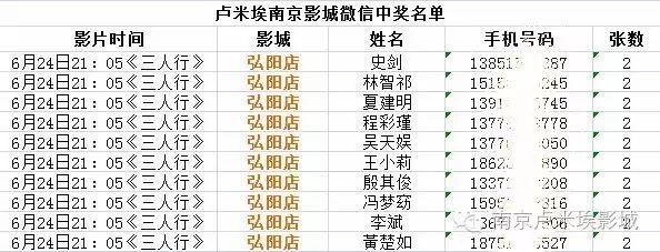 #中奖名单#恭喜以下观众获得《三人行》影票,请在影片放映前至弘阳影城检票口领取影票