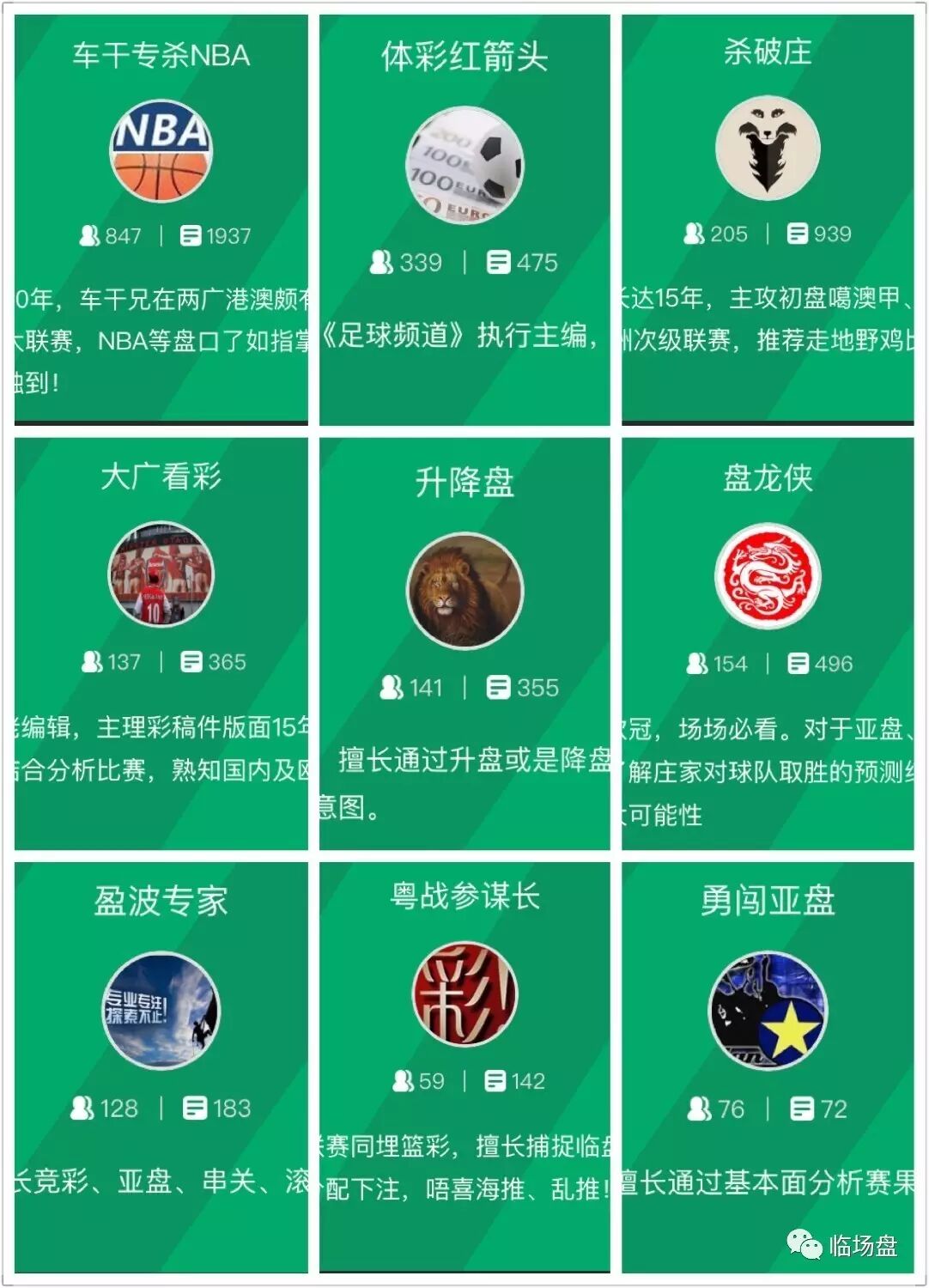 以下为粤语版9人:【车干专杀NBA】【体彩红箭头】【杀破庄】【大广看彩】【升降盘】【盘龙侠】【盈波专家】【粤战参谋长】【勇闯亚盘】
