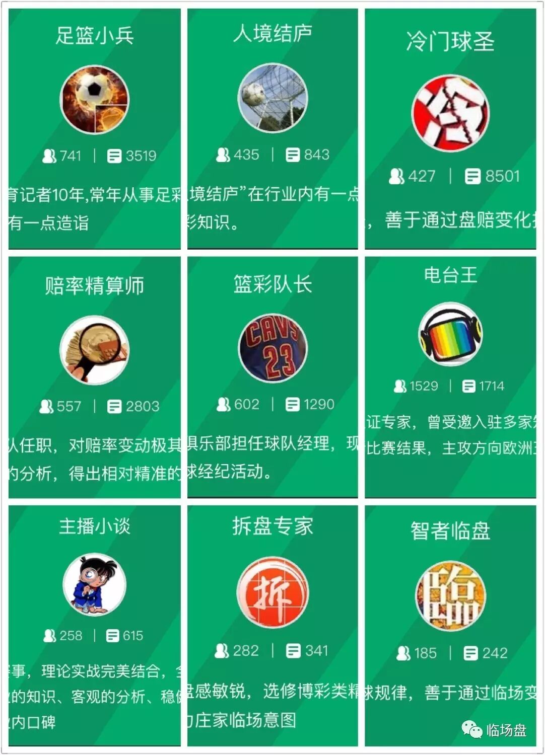以下为国语版9人:【足篮小兵】【人境结庐】【冷门球圣】【赔率精算师】【篮彩队长】【电台王】【主播小谈】【拆盘专家】【智者临盘】