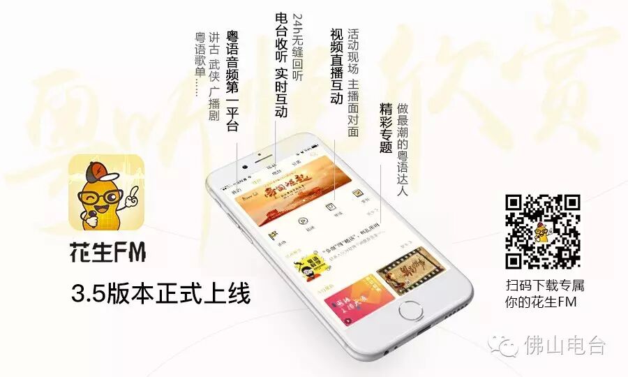 “花生FM”集合了几十个粤语广播电台直播,以及基于主持人粉丝圈的节目互动,海量粤语有声读物,广播剧,以及品牌节目,活动的视频直播,打破电台只闻其声不见图像的传统。