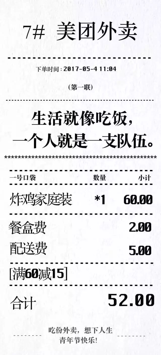 今年五四青年节时,美团外卖做了一次挺有意思的传播,上面几张外卖单,在我的朋友圈里小刷了一阵。