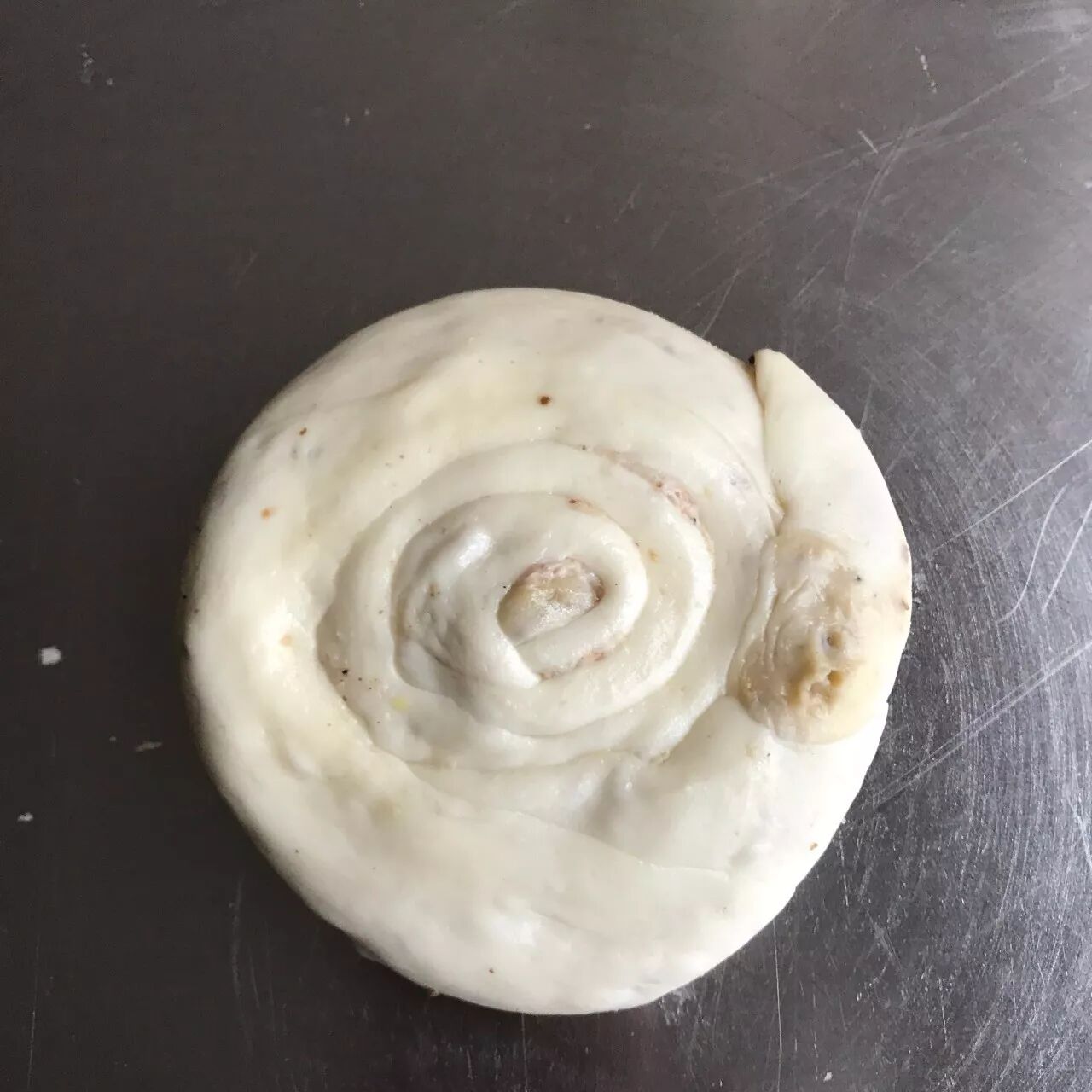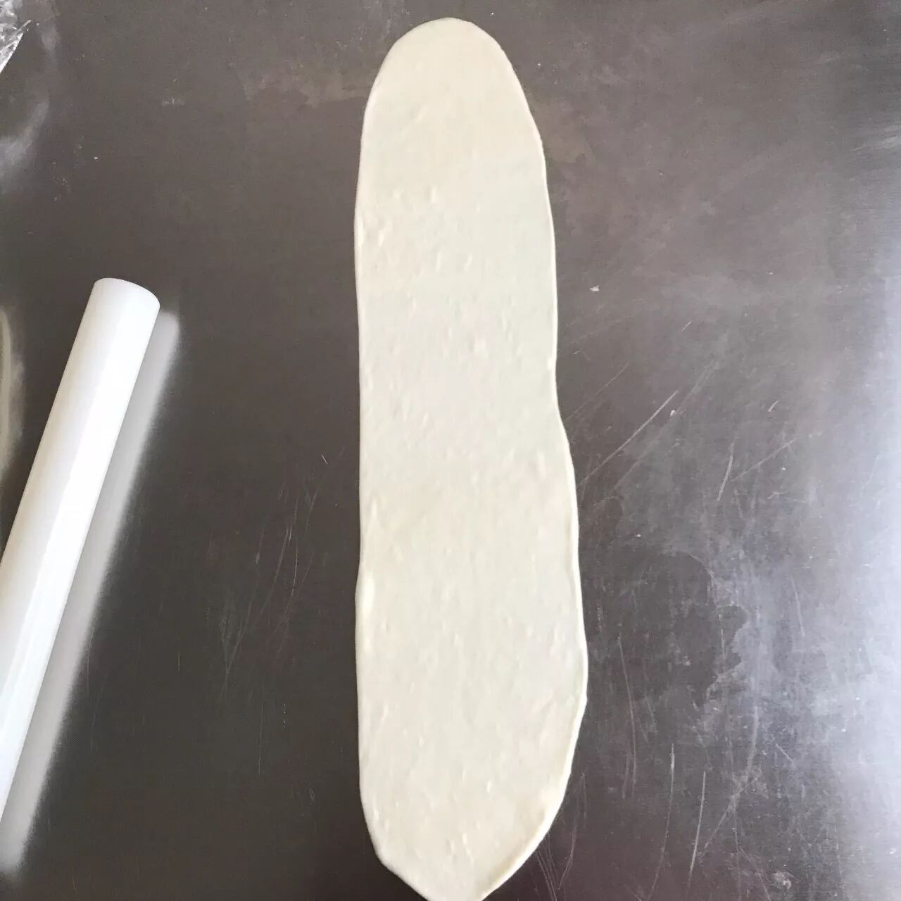 16. 案板抹少许菜籽油,面团竖放,稍按扁