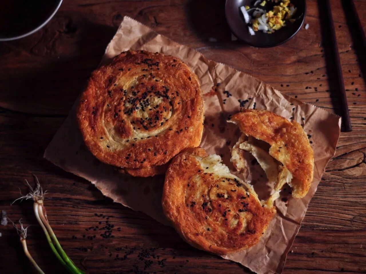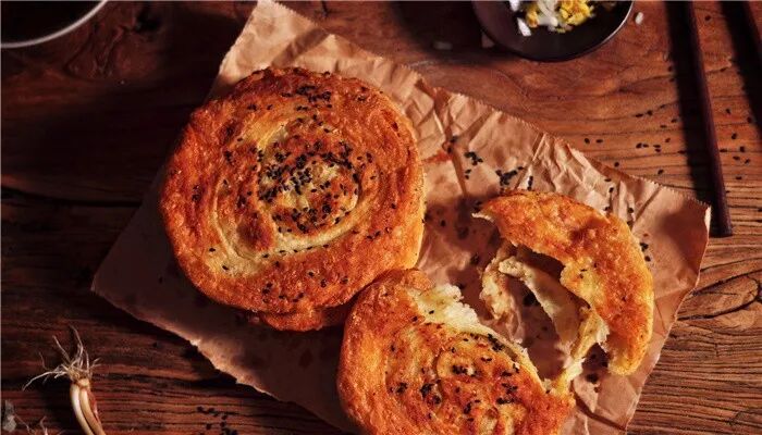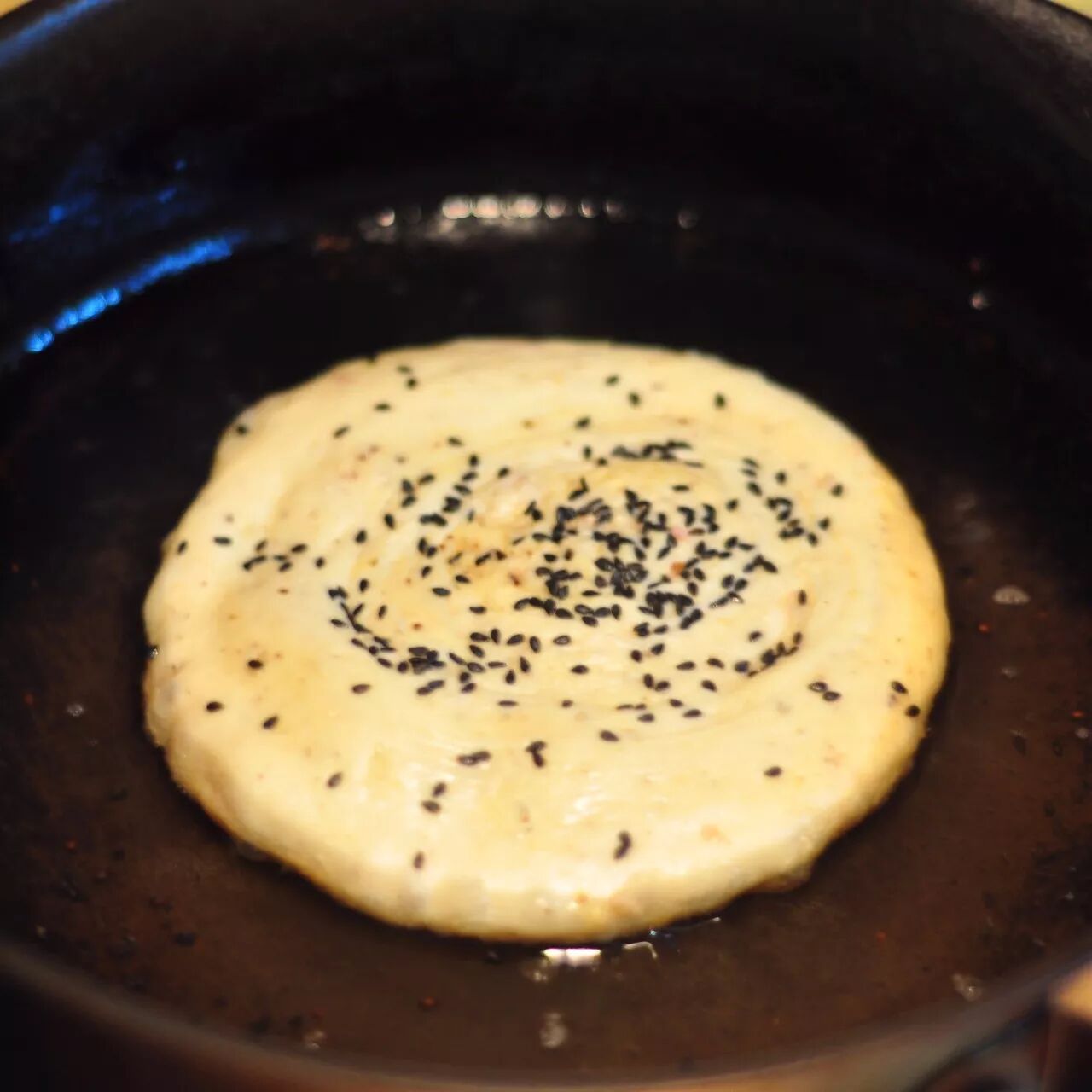 22. 平底锅中加入菜籽油,中火烧热,下饼皮,煎至两面金黄,捞出沥干油,排入烤盘