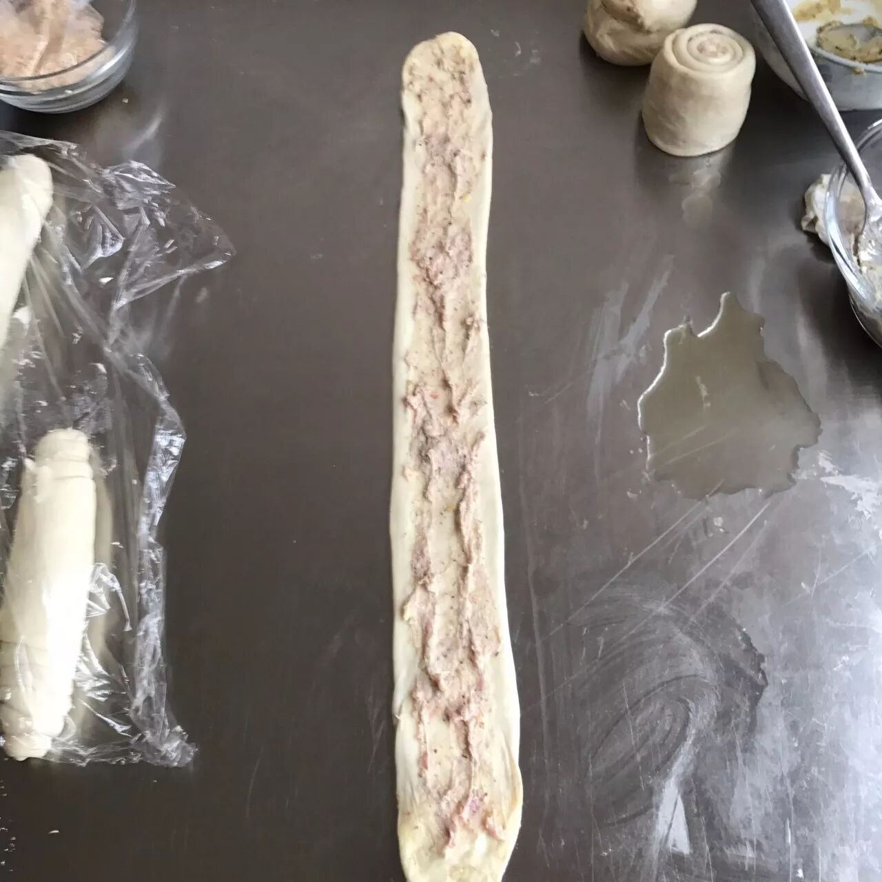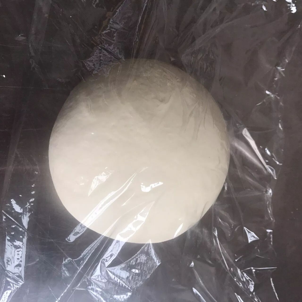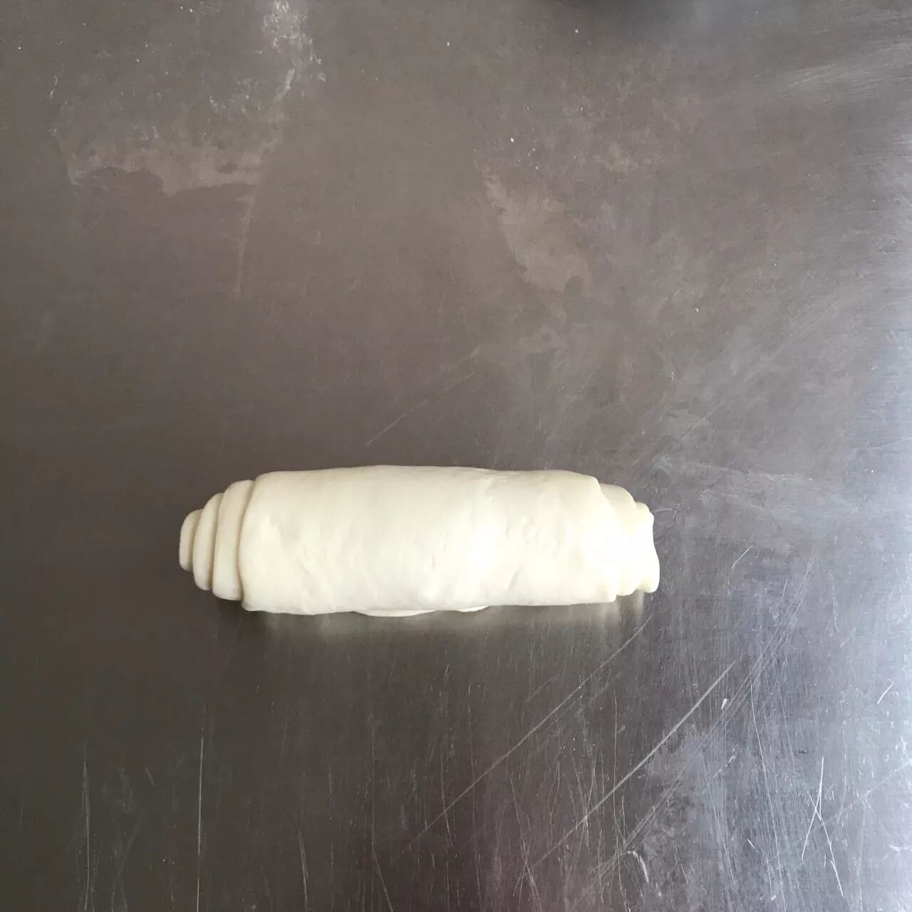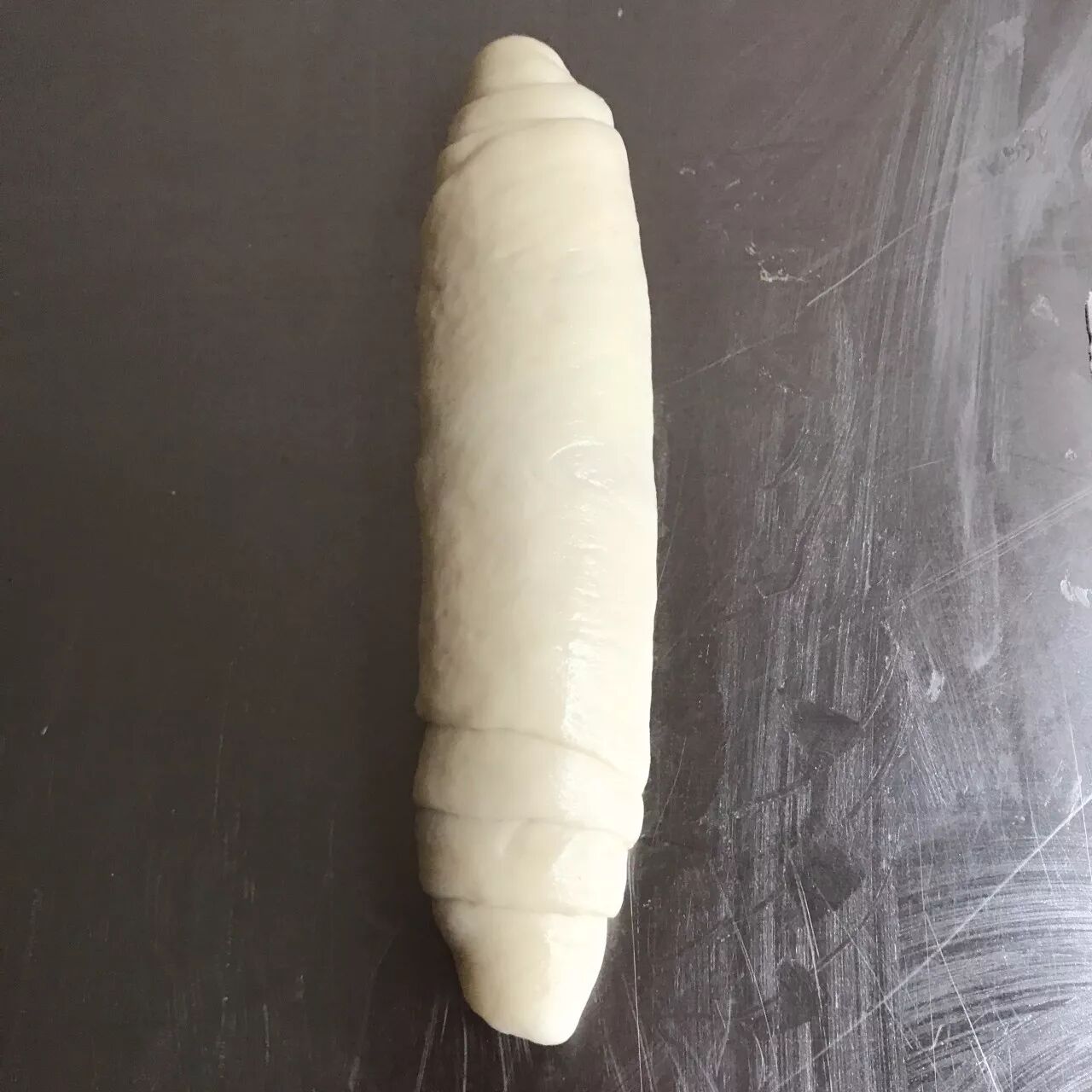 15. 从远离自己端开始卷起,提起面皮边拉长边卷,卷好后盖上保鲜膜静置松弛15分钟