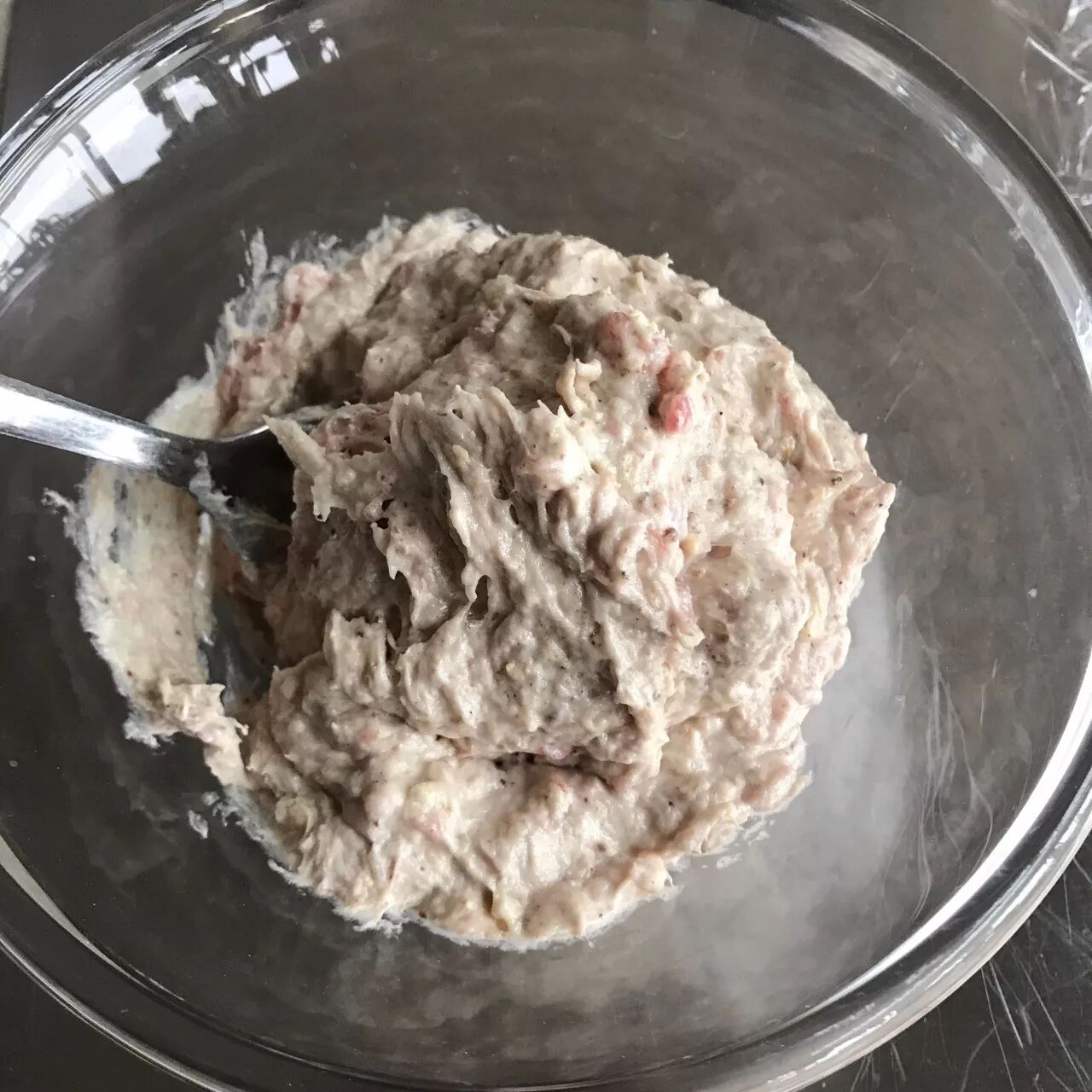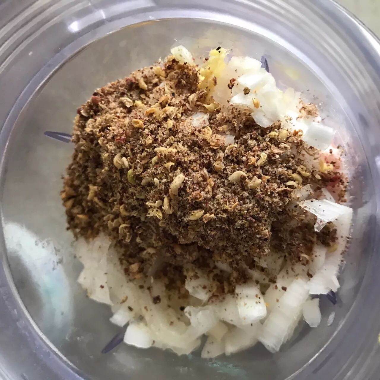 4. 将一半椒盐、葱花、姜末、胡椒粉加入肉馅中,放入料理机搅拌混匀