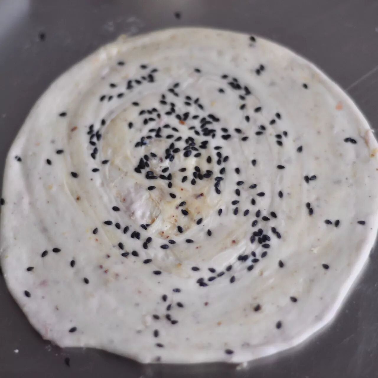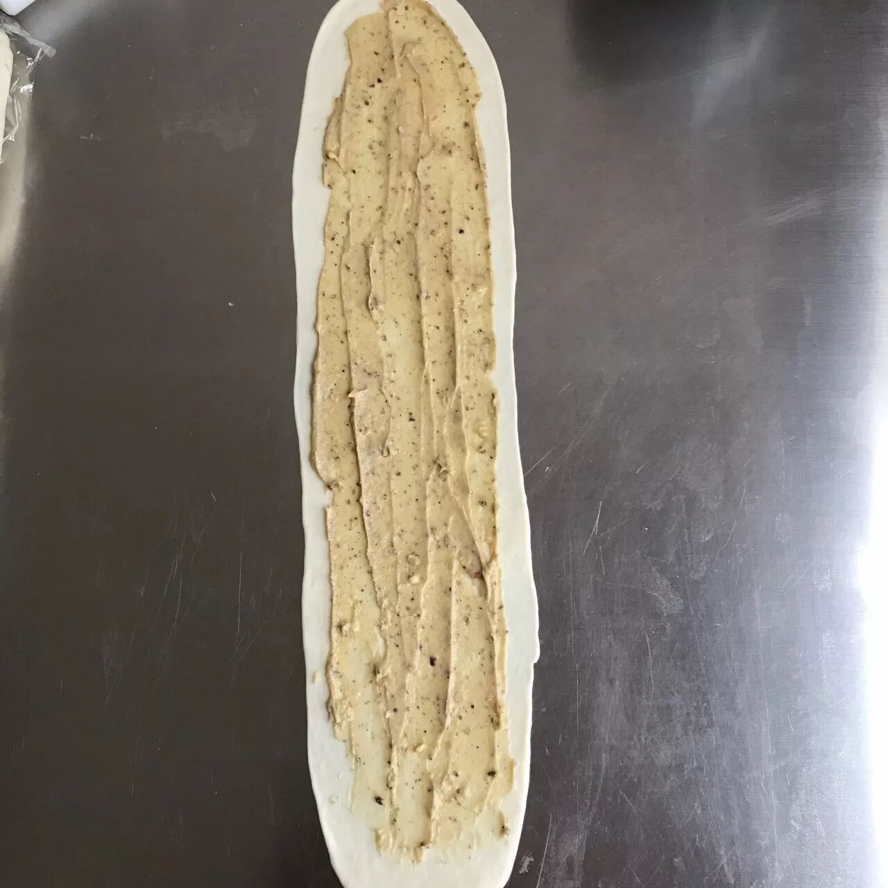 14. 均匀抹上油酥,注意边缘留出一部分不要抹到