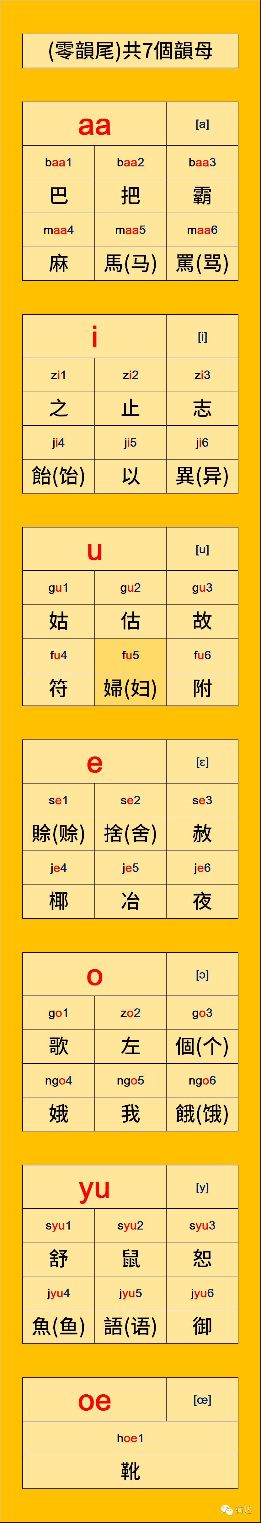 本篇介绍零韵尾的韵母,零韵尾就是没有韵尾。使用的拼音为“香港语言学会粤语拼音”,简称粤拼(Jyutping)。
