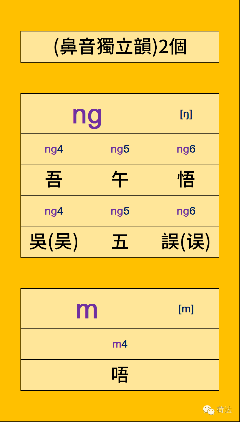 大多数人把这两个音混在一起,其实,只有“唔”是m,其他一律是ng。