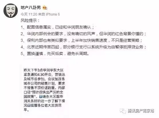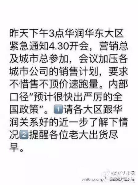 爆料称“华润大区要求各城市公司不订价速跑量”,并称“预计很快会出严厉的全国政策”。