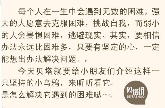小乌鸦在遇到困难的时候没有放弃,而是开动脑筋想出来解决办法,这就是下面这个成语表达的意思啦~一起来学习吧!
