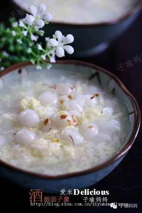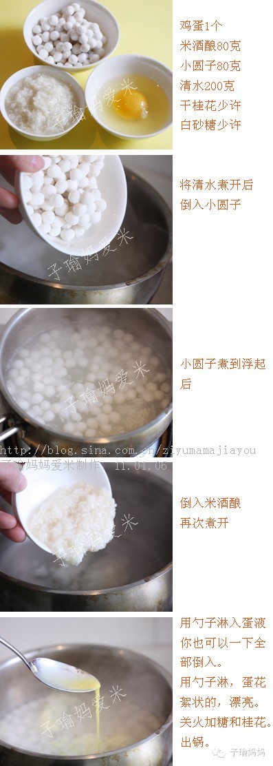 将清水煮开后倒入小圆子,小圆子煮到浮起后,倒入米酒酿再次煮开