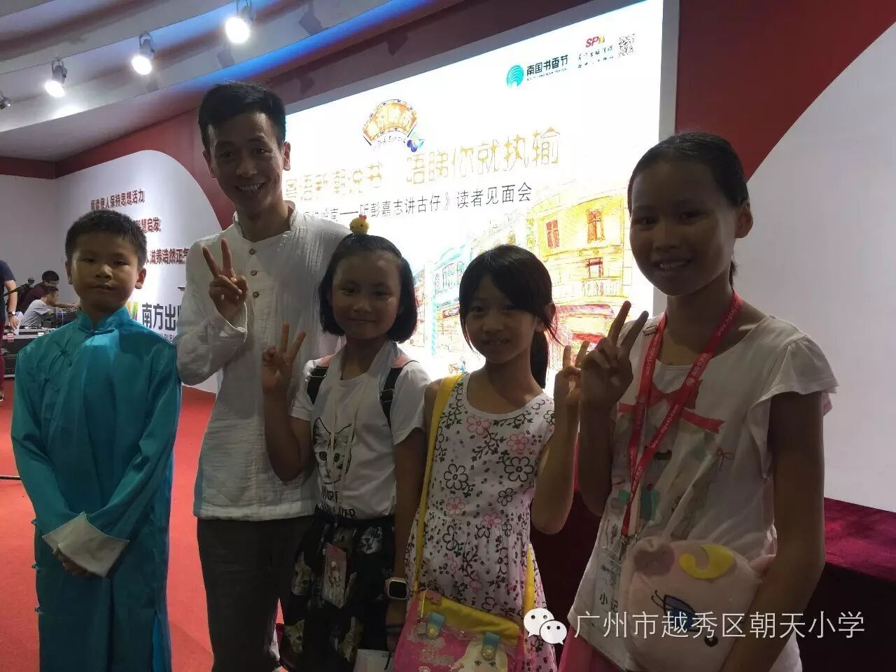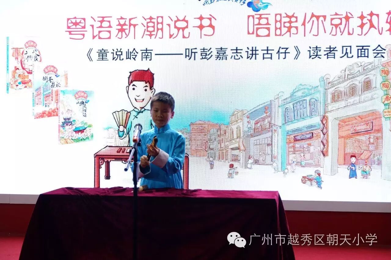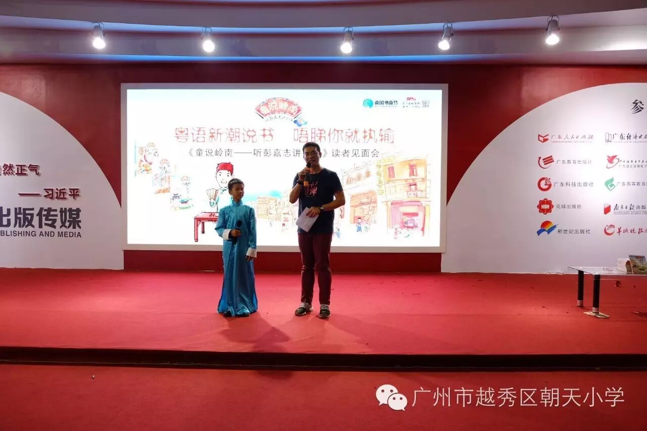 这时南国书香节广东展馆里热闹非凡。粤语说书传承人彭嘉志的新书《童说岭南------听彭嘉志讲古仔》读者见面会正在这里进行。来自越秀区朝天小学五年4班的曹维岳同学与中央人民广播电台华夏之声主持人陈建光一起主持了该活动。