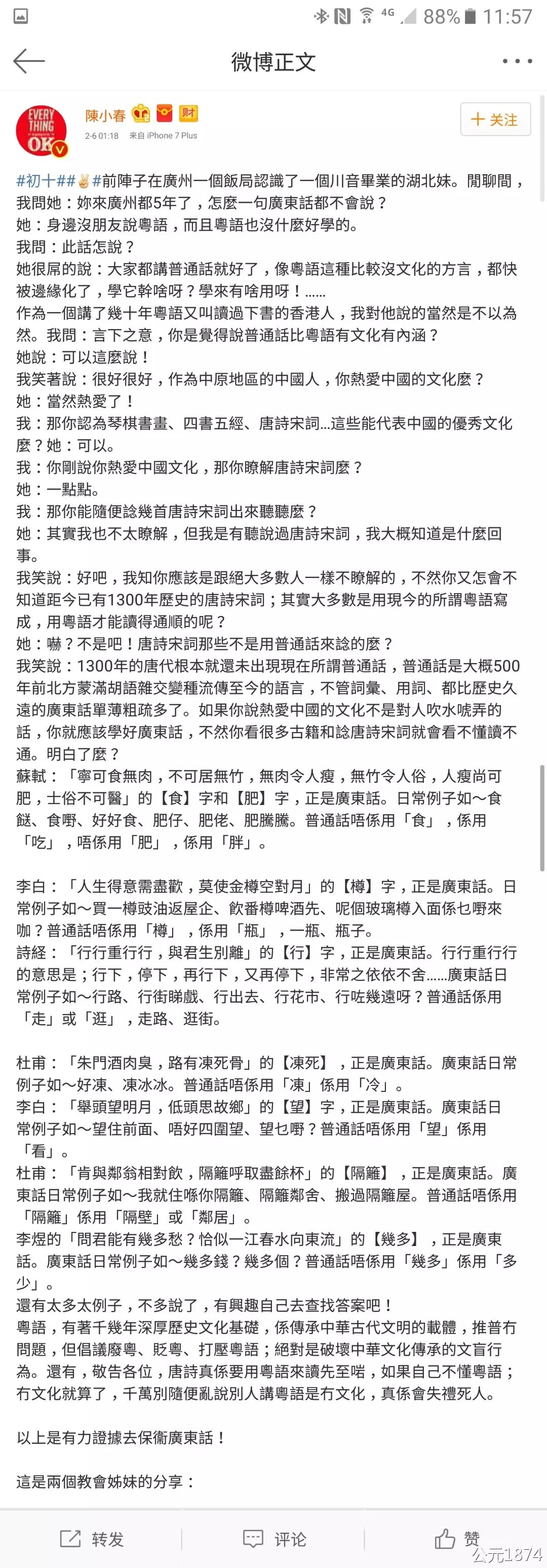先说其中的硬伤吧。这条浓浓的朋友圈转发文当中有一些本末倒置的内容,比如提到唐诗里的字词在如今的普通话口语里消亡了,但粤语还在用,进而推断说唐诗是用粤语念的。