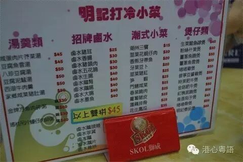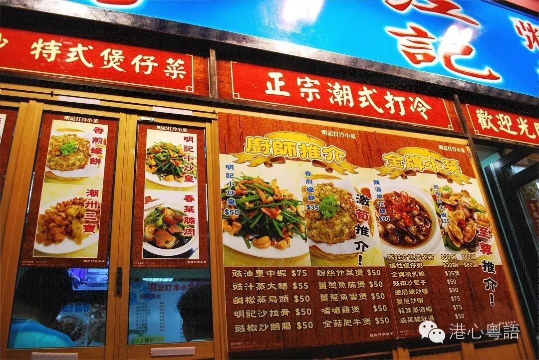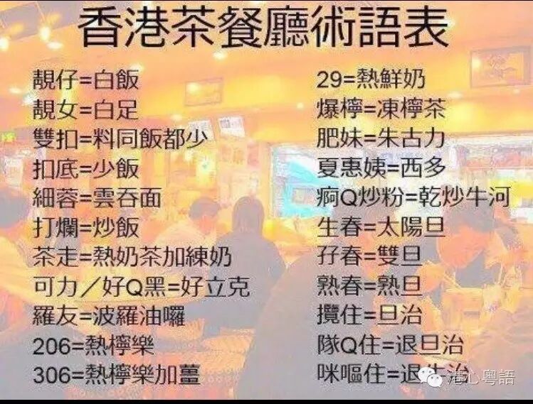 不少来到香港的游客都会来到香港独有的中西合璧、高效率、价钱平民化的茶餐厅,而茶餐厅也伴随着香港粤语的「发展」,可谓是称得上也拥有属于自己的粤语,这些茶餐厅用语有:「走冰」(不要冰的意思)、「行街」(外卖的意思)、「斋啡」(指只要纯咖啡/黑咖啡的意思)。或许是广州较少有茶餐厅,所以这些茶餐厅用语相对于广州粤语相对来讲是比较少出现的。![]()