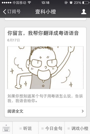 小橙压轴推荐的是壹科小橙这个本世纪最不正经教粤语的公众号。目前公众号会不定期分享各种虐单身狗,猎奇,旅游电影音乐以及粤语教学等各类文章,并且每篇文章都会结合内容教几句非常有用的日常粤语句子。