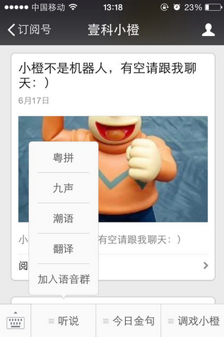 另外公众号也提供语音翻译功能,只需留言你想翻译的句子,小橙会回复你对应句子的粤语教学语音,超强定制化。除此以外,该公众号还连带绑定了7个粤语语音群,为你营造了一个超好的粤语环境。