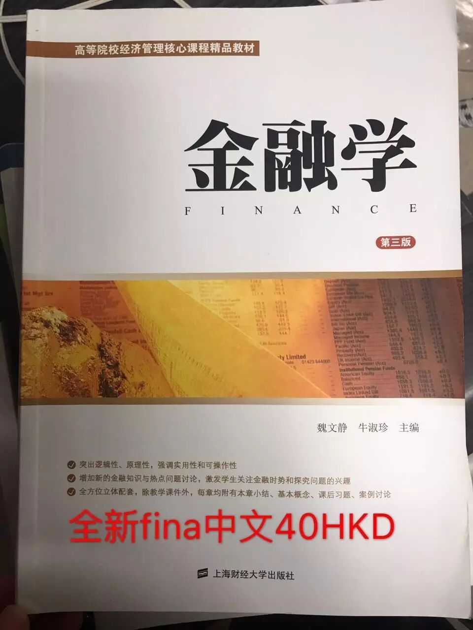 出售以下四本课本! Principles of Corporate Finance, Introductory Econometrics, Fundamental methods of mathematical economics, 和Financial markets and institutions的双语版。个别有一些些笔记,三本全英文教材都是大学书店买的,定价80一本(原价200-400不等),买的比较久了所以也许版本不是最新的,请大家核对清楚哦,版本信息都在图片里啦。 那本双语的大部分都是英文,60港币出售(原价88RMB)谢谢大家~有兴趣的请联系微信1356724321,注明一下谢谢
