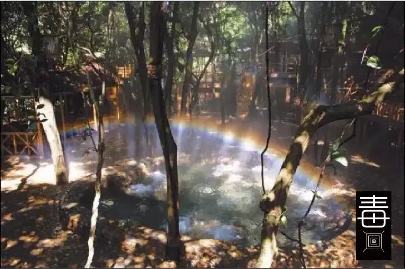 树上温泉是由粗壮的树干支撑着树屋腾空而起,即古朴而现代化的设施,每栋木屋之间还有木制的空中栈道连接。