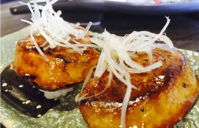 店里厚切三文鱼的色泽鲜艳,看起来就很有食欲,一整片入口,口感丰富。有一种柔软到侵蚀每一寸口舌的感觉。
