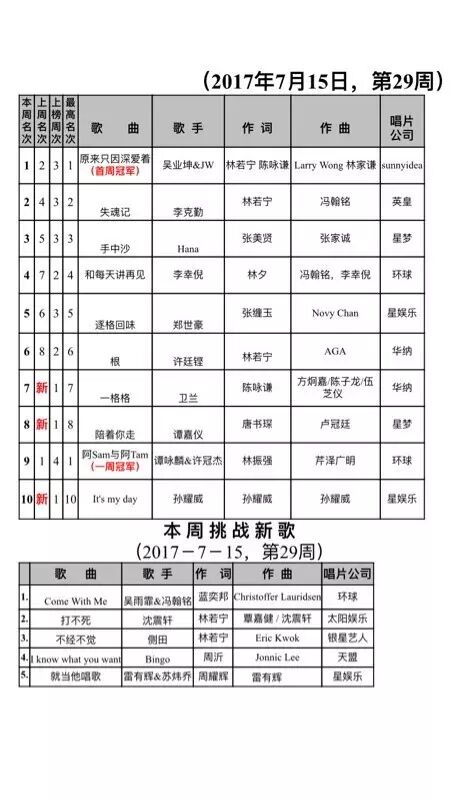 粤语榜丨2017粤语歌曲排行榜第二十九周成绩单:吴业坤&JW夺冠!