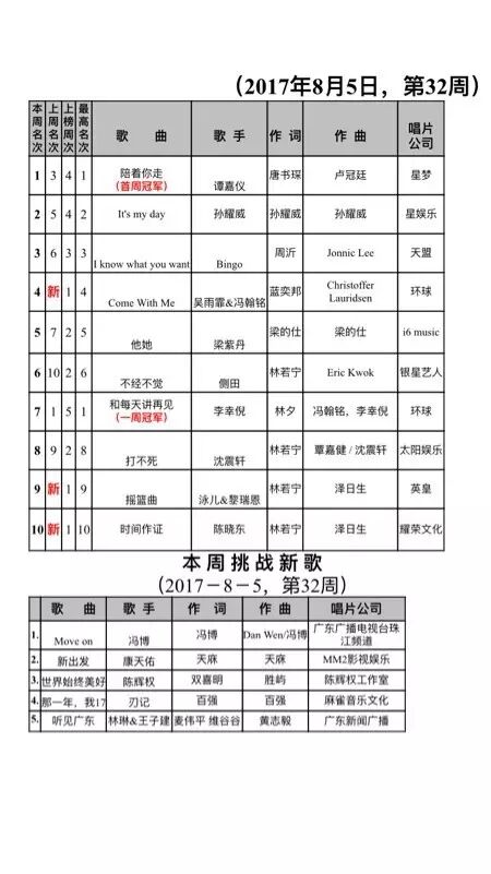 粤语榜丨2017粤语歌曲排行榜第三十二周成绩单:谭嘉仪夺冠!