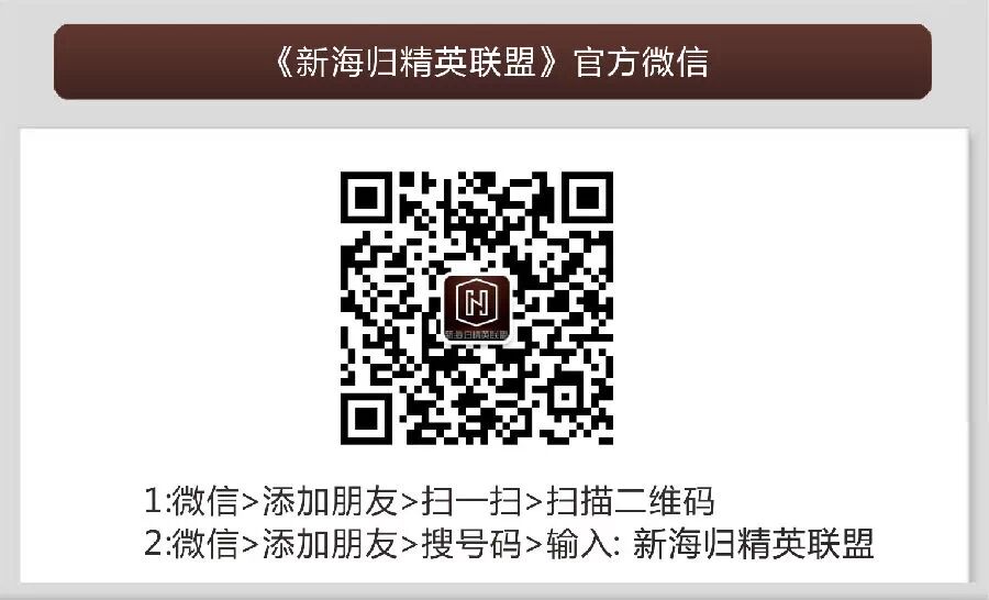 新海归精英联盟-官方微信平台是中国最大的海归,留学生,华人,海外人士等的信息咨询分享平台,目前已有超过【55万】海归留学生关注,微信平台成员来自近三十多个欧美国家和一百多个国际城市