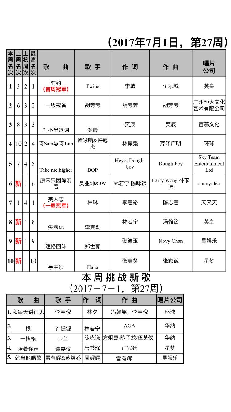 >粤语榜丨2017粤语歌曲排行榜第二十七周成绩单:Twins夺冠!