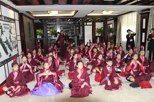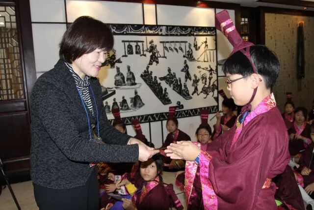 韩国小朋友们还上了一堂国学课,换上中国古代服饰,席地而坐,仔细聆听中国的国学文化