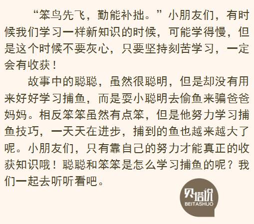 故事中的聪聪比较聪明,应该更快学会捕鱼,但是它却耍小聪明不愿意努力学捕鱼本领。相反,笨笨虽然没有聪聪那么聪明,但是十分刻苦地练习捕鱼技巧。小朋友们,我们也要靠自己的努力去收获有用的能力哦!下面这个成语也是形容努力学习就有收获,一起来学习吧!