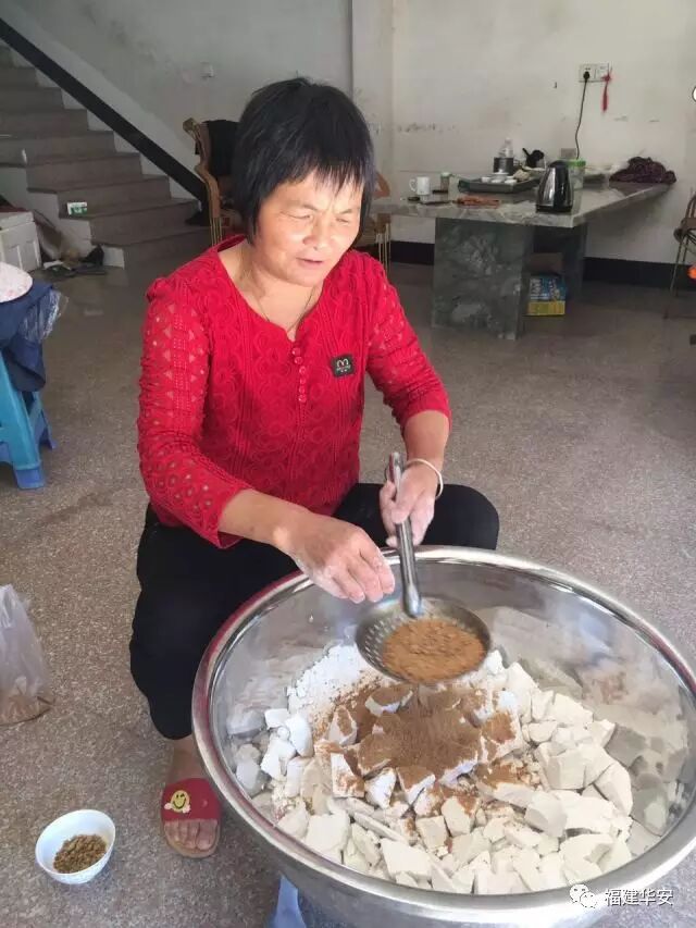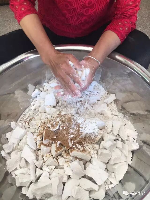 村民 黄月清:糯米买回来洗干净,放下去浸泡,浸泡三四个小时左右,浸泡好再去磨坊磨好,再用石磨压实,压实之后这个糯米粉在拿去晒太阳,晒好之后,还要和糖下去搅拌,一斤米需要用半斤糖搅拌,等糖融化后才可以开始做。