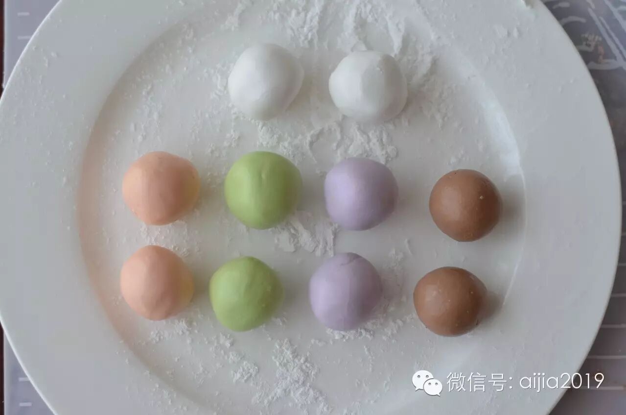 糯米粉按4:1分两份,大份的加牛奶和成白色面团,小份的糯米粉+色素+温水和成面团。搓1大4小5个白球球和红球球然后组合起来就好了,组合的时候先把白球球拼完,再粘上红球球![]()