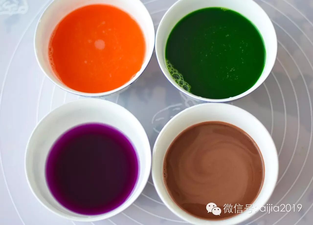 红色部分可以用红曲粉,也可以用紫薯+柠檬汁也可以得到红色色素,因为紫薯中含有的花青素,花青素是一种水溶性色素,可以随着细胞液的酸碱改变颜色。细胞液呈酸性则偏红,细胞液呈碱性则偏蓝。还有苋菜汁也行。![]()