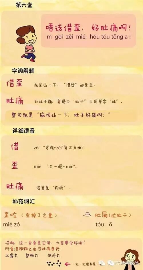唔该借歪,好肚痛啊!(麻烦借一下,肚子好痛啊!)