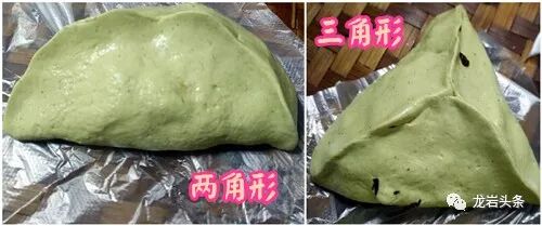 将准备的艾草捣碎,和糯米粉揉匀,面团就呈淡绿色,作为“鬼糕”的皮。