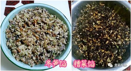 一般有两种馅料:冬笋馅和梅菜馅。这两种馅料都可以加香菇、虾米、目鱼干、五花肉和豆干,根据各自的口味任意调整搭配,可以包成像包饺子一样的两角形,或者小金字塔的三角形。