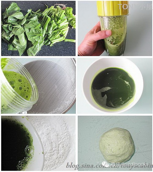 4-50克菠菜切成小段后放入搅拌器加入120水打成菠菜泥后过滤成120克左右的菠菜汁;