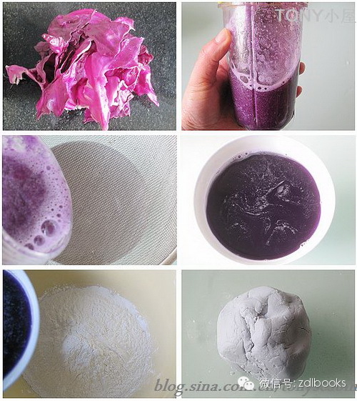 6-紫甘蓝70克,放入搅拌器,加150克水,过滤后得大约110克紫甘蓝汁;