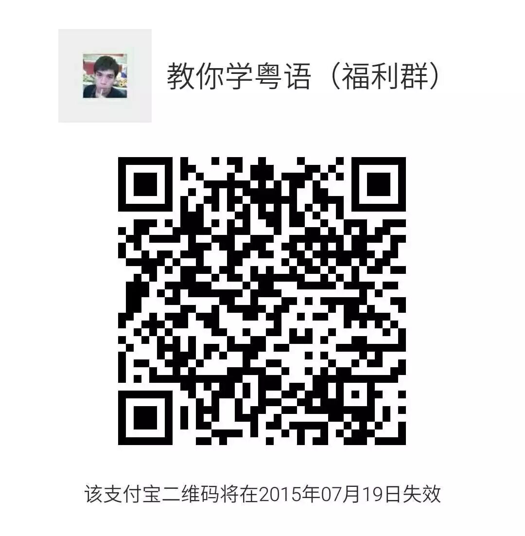 把下面的二维码保存到手机,用支付宝(最新版本)扫描进群后就可以获取粤语培训教程一套。