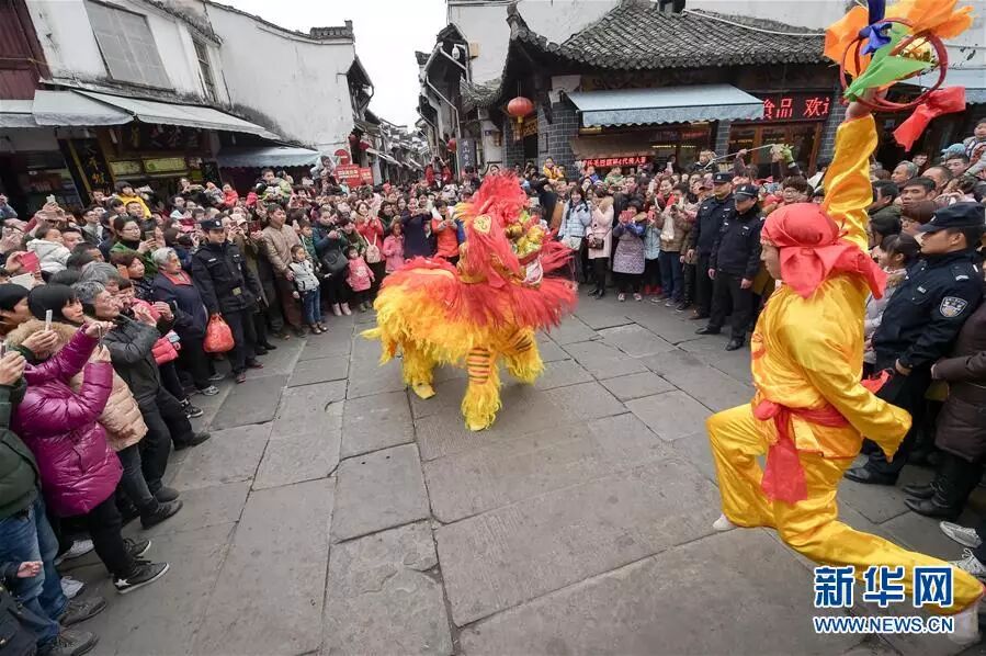 2月21日,群众演员在安徽省黄山市屯溪老街表演舞狮。