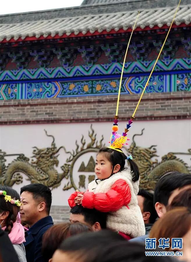 2月21日,一名戴头饰的小朋友在河南开封万岁山庙会上观看民俗表演。