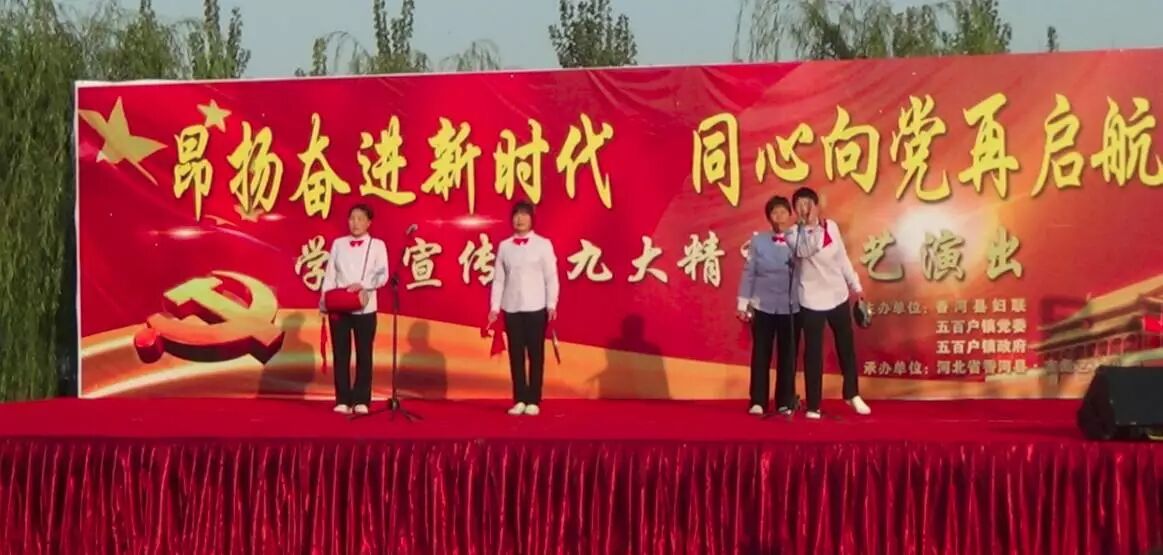 近日来,全省各级妇联组织迅速掀起了学习宣传贯彻党的十九大精神的热潮,举办了多种形式的活动,认真学习宣传贯彻党的十九大精神。11月1日下午,廊坊市香河县妇联联合五百户镇党委政府在六百户村文化广场举办了“昂扬奋进新时代·同心向党再启航”文艺演出。参加活动的有县委副书记杨波同志,县妇联全体干部,五百户镇党政班子同志,各镇、街道、园区妇联主任,五百户镇机关干部、43个村街“两委”干部及周边群众500余人。活动内容精彩纷呈,好看的节目一个接着一个,姐妹们纷纷表示要不忘初心跟党走,新时代再建新功。