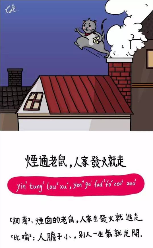旧时人家的厨房都会有一个烟囱,是用来排烟的。当用炉灶的时候,热烟就会企烟囱排出,这个时候,藏在烟囱里的老鼠就会因为被烟熏到而逃跑,因为不逃走的话,随时会被烧死或者熏死的。 擅长用各种生动形象的事情来作为俗语的广东人就会用「烟通老鼠,人家一发火就走」来形容这种场景,慢慢的,这句话就用来比喻那些表面上纠缠不清、吓吓霸霸的人,一遇到对方表示强硬斥责态度的时候,就会躲的远远的。