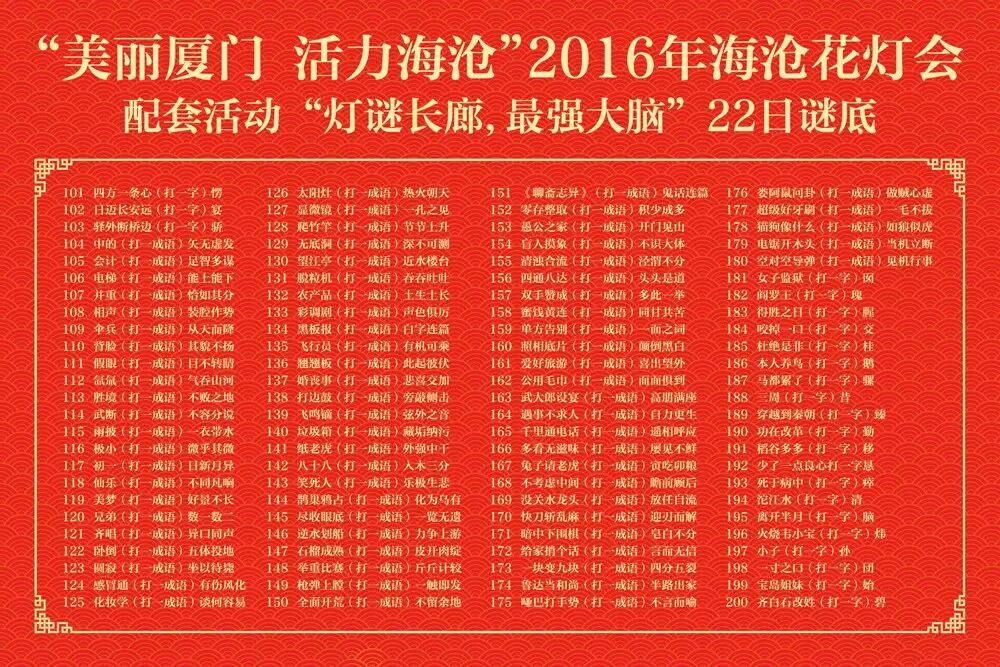 下面我们将公布今日100条精彩灯谜的谜底以及50名幸运中奖者名单,今天,你中奖了吗?快来看看吧。
