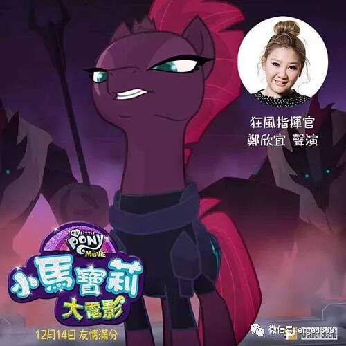 届时将会有粤语版本,并将会对歌曲进行翻唱!粤语配音阵容中不乏有知名艺人,目前已公布的有林嘉欣(配音暮光闪闪)、郑欣宜(配音暴风指挥官Tempest Shadow)以及徐天佑(配音卡柏Capper)PS.一般来说,英文原版也会有排片的请大家放心