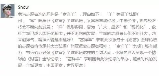 从即日起至11月20日,大家可将自己心目中的财富论坛志愿者昵称和设计寓意发送至“广州青年”微信公众号后台,届时将由“广州青年”挑选出符合设计要求的20个昵称,以微信推文的形式发布,并进行网络投票,得票最高的昵称将被确定为2017广州《财富》全球论坛志愿者官方昵称。