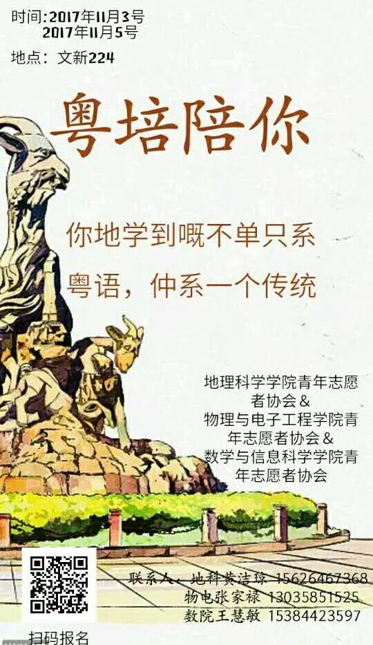 广东属岭南文化三大块之一,而作为广东文化的中心--广州更不用说,广州人的母语是粤语。学会粤语不仅能使自己更快地融入广州的生活,还能从新的角度领略岭南文化的独特韵味,在广州使用粤语与人交谈更使人倍感亲切。我们本次粤语培训活动在广州大学内举行,由物理与电子工程学院、地理科学学院、数学与信息科学学院的青协联手举办,目的在于让一些听不懂粤语的小伙伴们尽快融入广州大学这个大家庭。