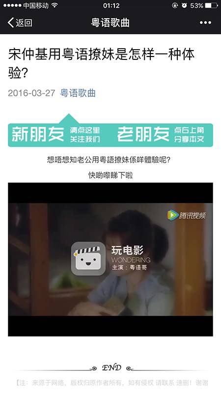 在Simon看来,这些人剽取教你学粤语的原创教程根本不是为了传播粤语,就是为了做点粉丝,赚点广告费。有关注粤语歌曲公众号的人都知道,这个账号只会上网复制素材,然后发发教程,然后打打广告。