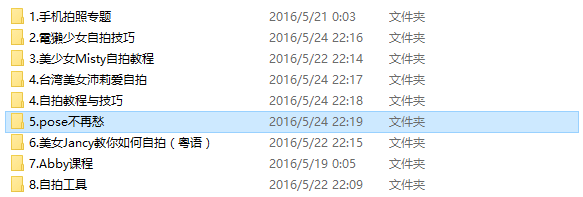 本资源包括:王自如团队、ZEALER|MEDIA出品的《手机拍照专题》,《电獭少女自拍技巧》,《美少女Misty自拍教程》,《台湾美女沛莉爱自拍》,《自拍教程与技巧》,《pose不再愁》,《美少女教你如何自拍(粤语)》,《Abby课程》等